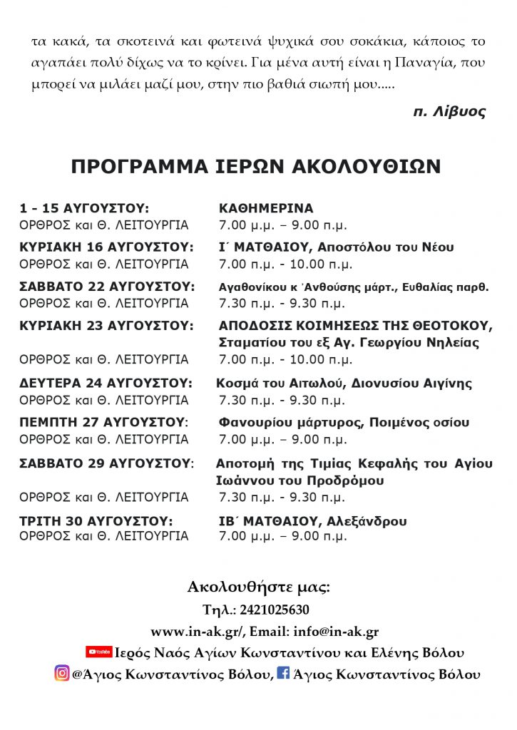 ΛΑΤΡΕΥΤΙΚΟ ΠΡΟΓΡΑΜΜΑ ΜΕΓΑΛΗΣ ΕΒΔΟΜΑΣΔΟΣ ΙΕΡΟΥ ΝΑΟΥ ΑΓΙΩΝ ΚΩΝΣΤΑΝΤΙΝΟΥ κ΄ ΕΛΕΝΗΣ ΒΟΛΟΥ